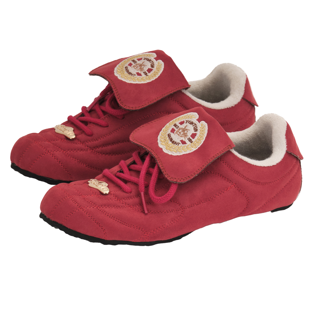 A signature elevated-stitch design with a distinctive puffed effect and a removable tongue for versatile styling. Premium synthetic upper with a stainless-alloy GOAL logo; Rubber material with flat sole 0.5cm thick and custom-molded for a unique effect, highlighted by the GOAL creator’s emblem. Red color — sizes 36–46. Lifetime warranty on sole glue.