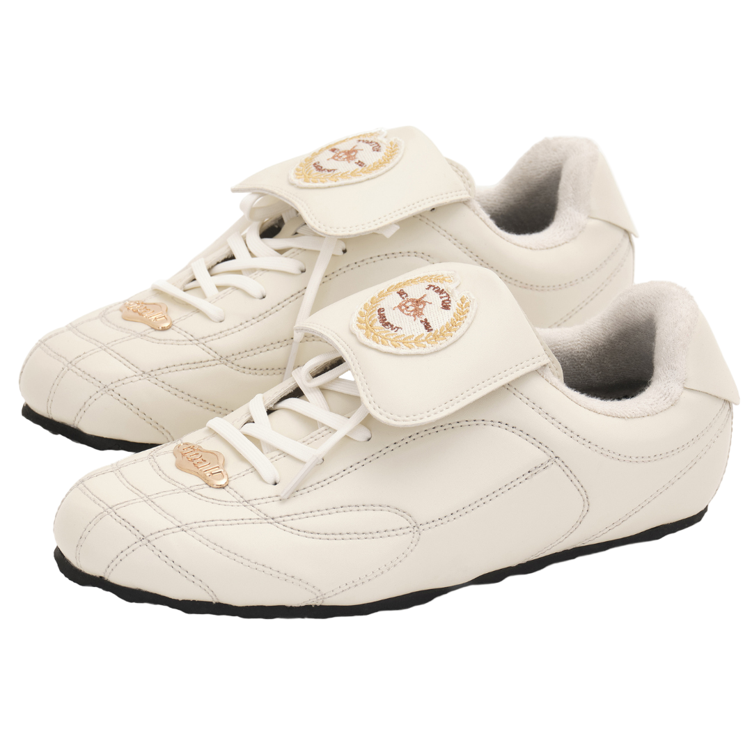 A signature elevated-stitch design with a distinctive puffed effect and a removable tongue for versatile styling. Premium vegan leather upper with a stainless-alloy GOAL logo; Rubber material with flat sole 0.5cm thick and custom-molded for a unique effect, highlighted by the GOAL creator’s emblem. Cream white original color — sizes 36–46. Lifetime warranty on sole glue.