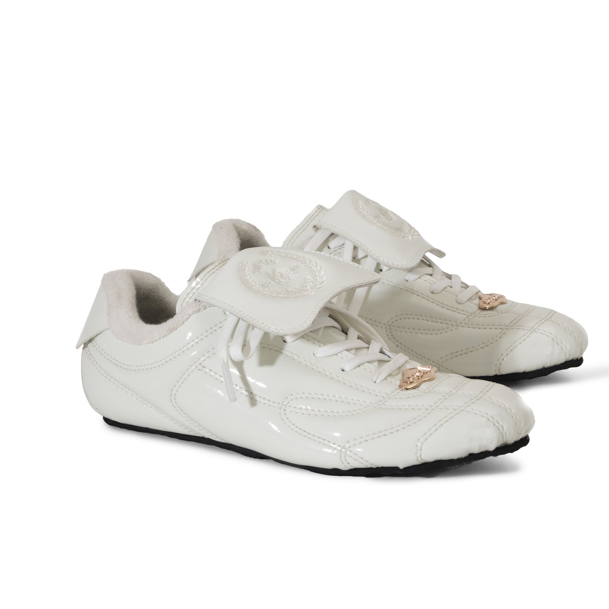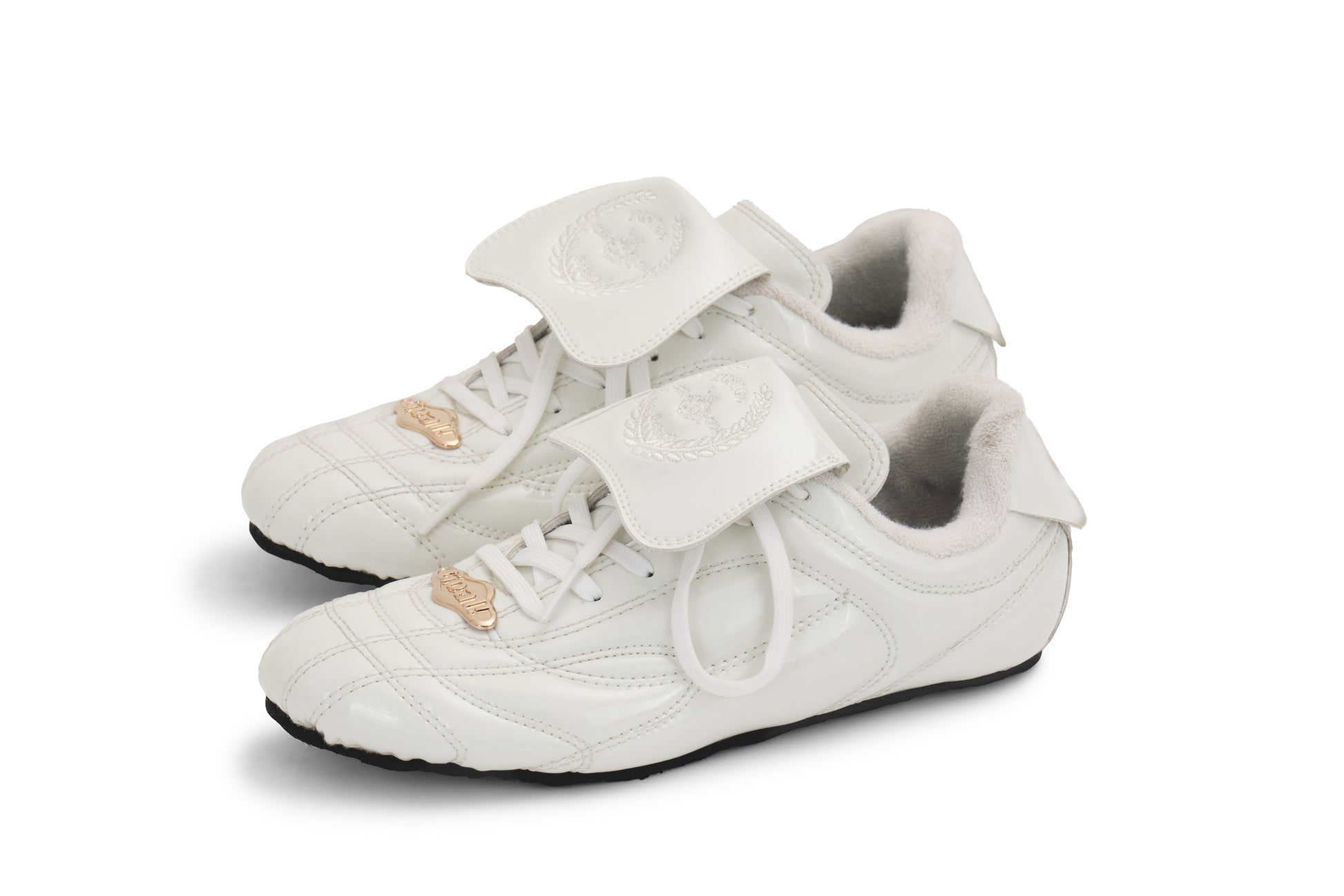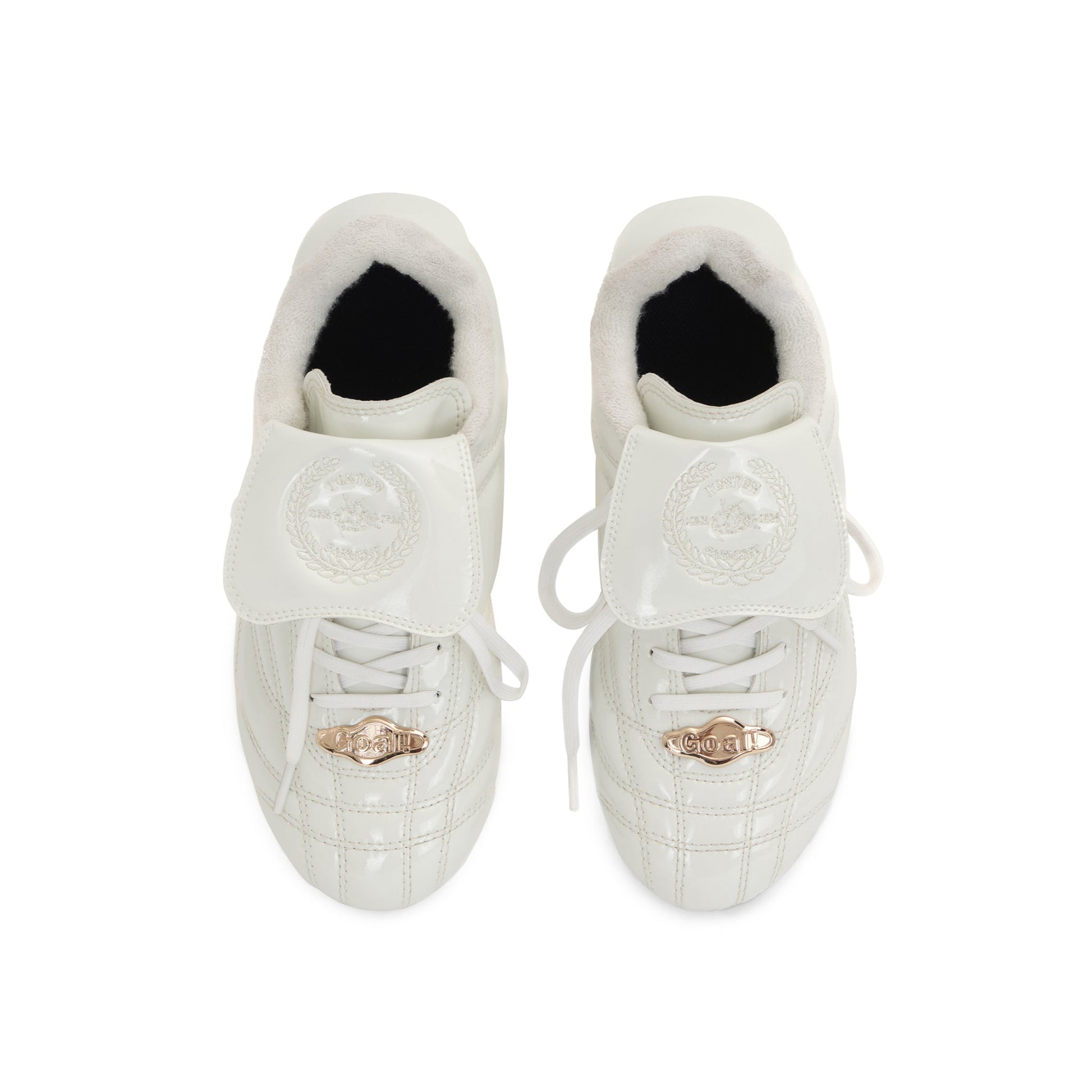 A signature elevated-stitch design with a distinctive puffed effect and a removable tongue for versatile styling. Premium vegan leather upper with a stainless-alloy GOAL logo; Rubber material with flat sole 0.5cm thick and custom-molded for a unique effect, highlighted by the GOAL creator’s emblem. Shiny white color — sizes 36–46. Lifetime warranty on sole glue.