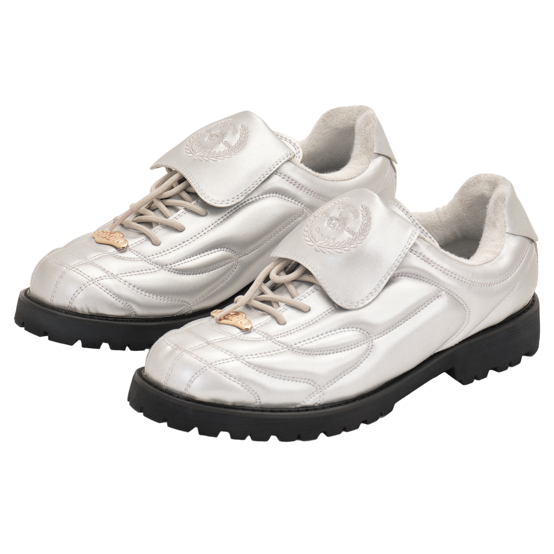 A signature elevated-stitch design with a distinctive puffed effect and a removable tongue for versatile styling. Premium vegan leather upper with a stainless-alloy GOAL logo; Rubber material with commando sole height 3.5cm and custom-molded for a unique effect, highlighted by the GOAL creator’s emblem. Shiny Sliver color — sizes 38–46. Lifetime warranty on sole glue.
